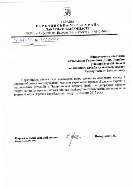 Перечинська міська рада в особі міського голови Івана Погоріляка, висловлює щиру вдячність особовому складу 1-ї державної пожежно-рятувальної частини Управління ДСНС України у Закарпатській області, який неодноразово проявив оперативність та професіоналізм під час ліквідації наслідків погіршення погодних умов, що виникли на території м. Перечин 13-14 січня 2017 року.