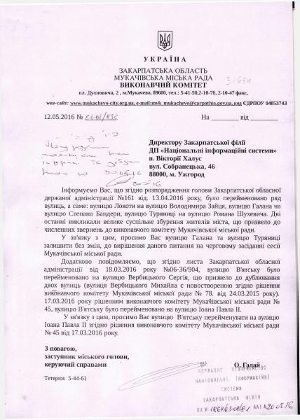 Підставою для цього став лист Мукачівської міськради в Закарпатську філію Національних інформаційних систем від 12.05.2016р., у якому йдеться, що перейменування вулиць С.Бандери та Р.Шухевича