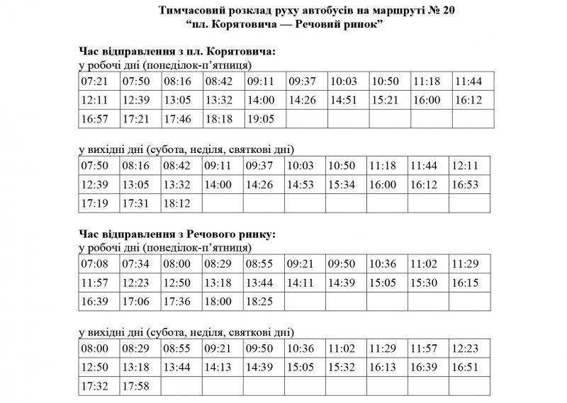 Тимчасовий розклад руху автобусів на маршруті № 20 “пл. Корятовича — Речовий ринок” - на фото