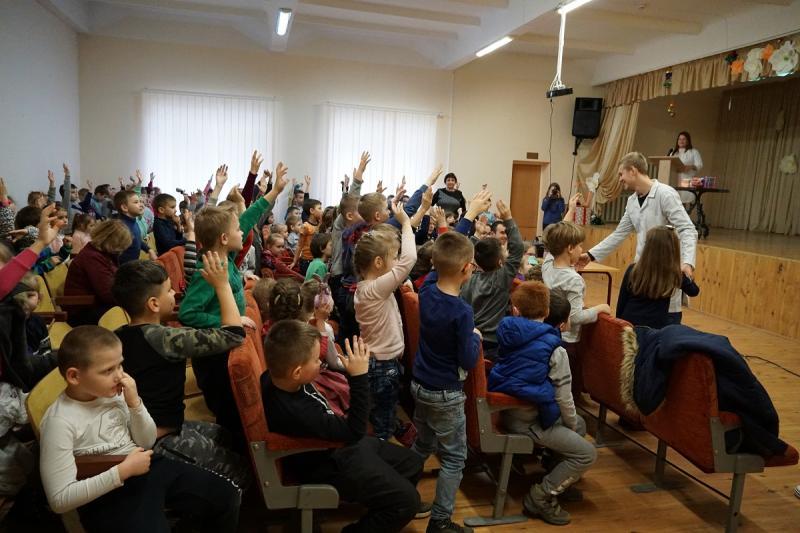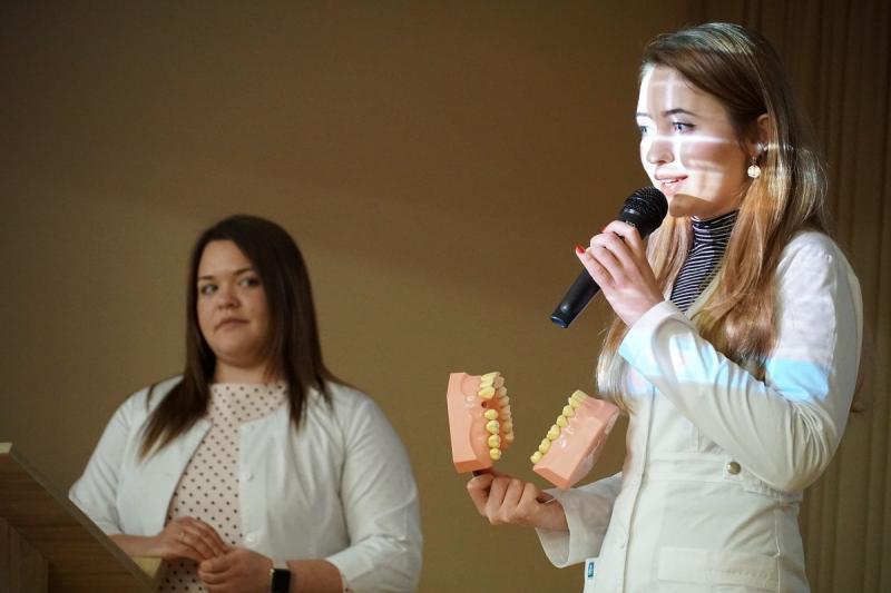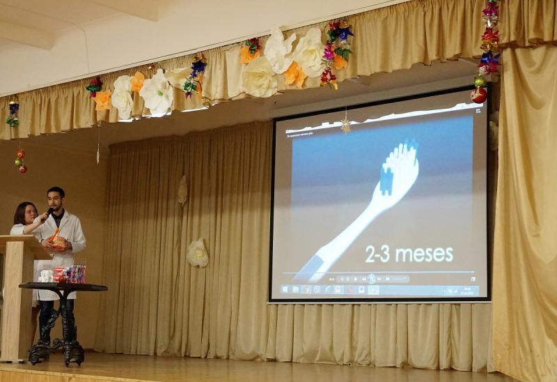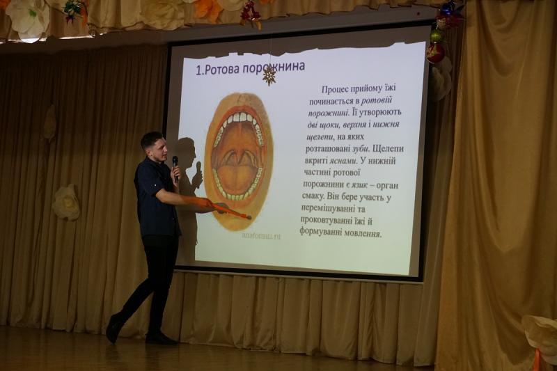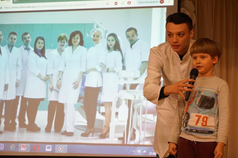 Більше сотні учнів початкової школи зібралися в актовому залі середньої школи. Майбутні лікарі розповідали дітям про те, чому варто чистити зуби і наочно – на прикладі великої штучної щелепи та за допомогою гігантської зубної щітки – показували, як це робити. Чи всі діти мають свої індивідуальні зубні щітки? Чи всі користуються зубною пастою щоранку і щовечора? Першачки схвально гукали у відповідь на ці питання і хочеться вірити, що так справді і є. Діти декламували вірші, брали участь у інтерактивних опитуваннях і отримували за це чудові подаруночки – зубні пасти і щіточки. А насамкінець переглянули мультиплікаційний фільм, у якому герої-звірята розповідали про злісних каріозних монстрів та боролися з ними.