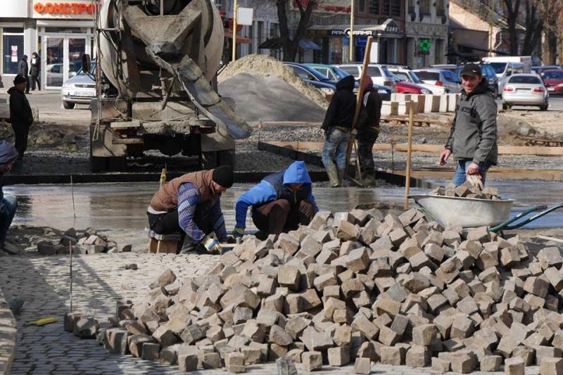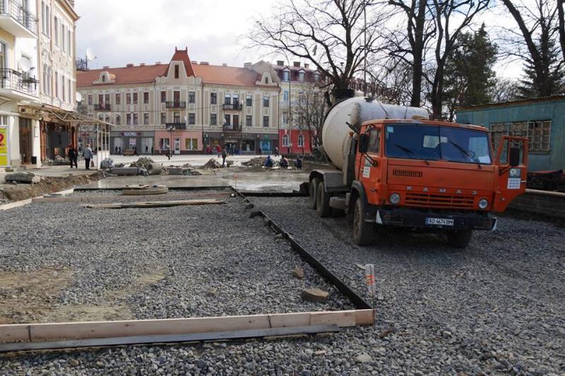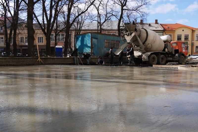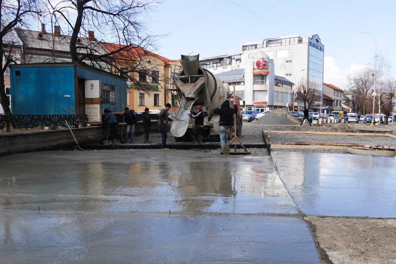 Ремонт площі Шандора Петефі в Ужгороді: бетонують основу проїжджої частини, продовжують викладати бруківку