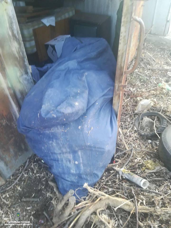 Оглянувши прилеглу територію, інспектори виявили ще один гараж з відкритими воротами, та особу, яка, помітивши патрульних, спробувала сховати мішок синього кольору.