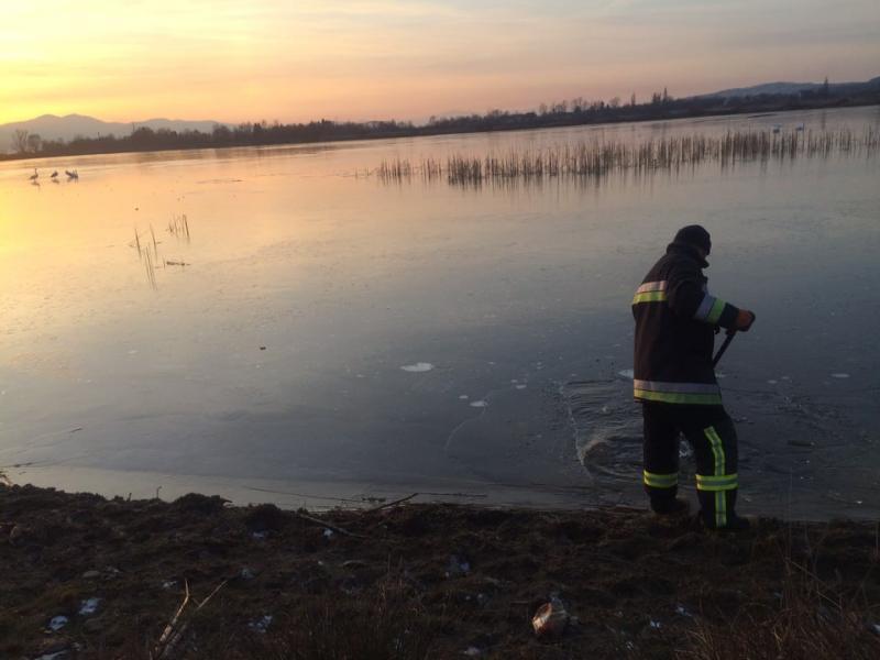 Тячівські надзвичайники рубали кригу, щоб врятувати родину лебедів (ФОТО)
