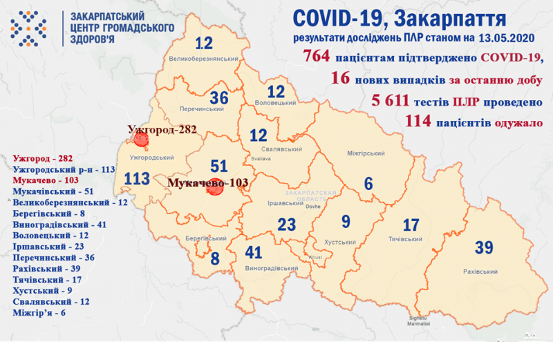 - Загалом по області станом на 13 травня 2020 року 764 хворим встановлено діагноз COVID-19. З них 177 – медичні працівники та 41 - діти. Проведено 5611 досліджень на полімеразну ланцюгову реакцію;
