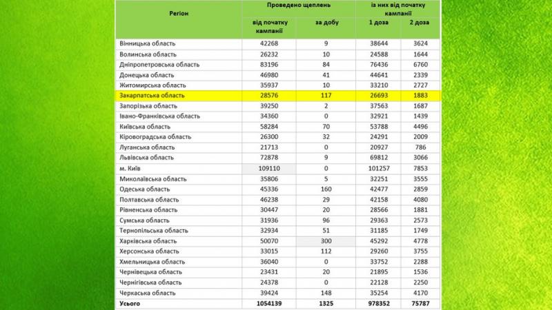 - З 27 квітня на Закарпатті збільшили кількість пунктів щеплення до 51-го. Також в області діють 13 мобільних бригад для проведення вакцинації.