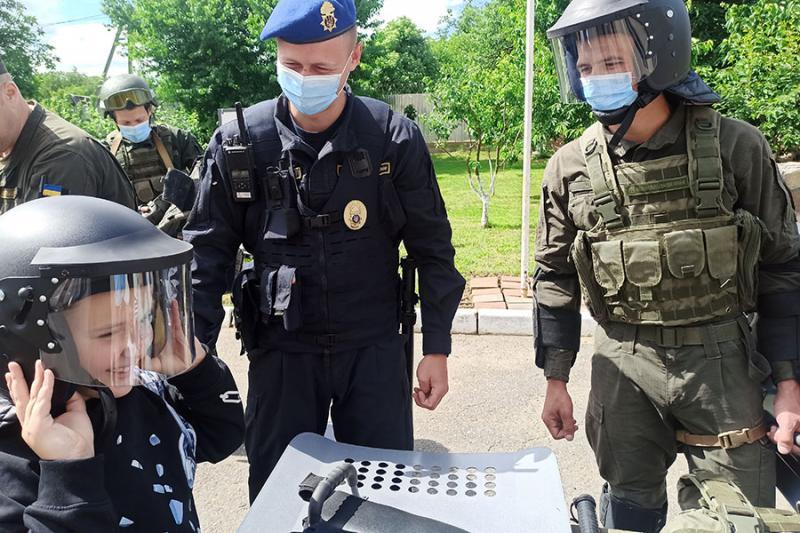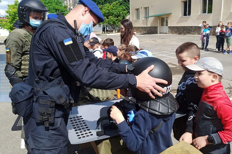 На території батальйону національні гвардійці продемонстрували дітворіозброєння, спеціальні засоби та техніку, якими користуються у повсякденній діяльності. Малеча із захопленням оглядала зброю, приміряла шоломи, протигази та інше спорядження.