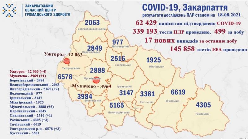 За даними закарпатського обласного центру громадського здоров’я, загалом в області з початку пандемії діагноз COVID-19 встановили у 62 429 людей. 60 579 пацієнтів подолали хворобу, 1 611 — померли.