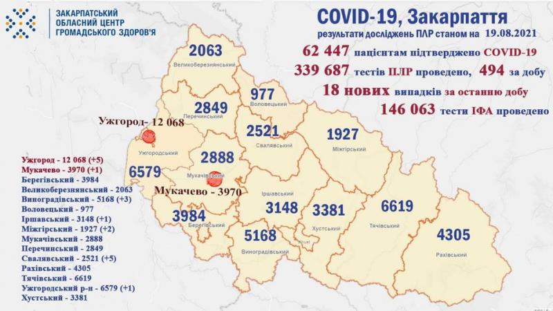 18 нових випадків COVID-19 виявили на Закарпатті за минулу добу, 18 серпня. Такі дані повідомляє Закарпатський обласний центр громадського здоров’я на сторінці у Facebook. За добу троє пацієнтів одужали, ніхто не помер.
