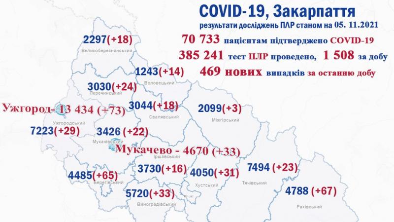 469 нових випадків COVID-19 виявили на Закарпатті за минулу добу, 4 листопада. Такі дані повідомляє Закарпатський обласний центр громадського здоров’я на сторінці у Facebook. За добу 116 пацієнтів одужали, 12 людей з діагнозом COVID-19 померли.