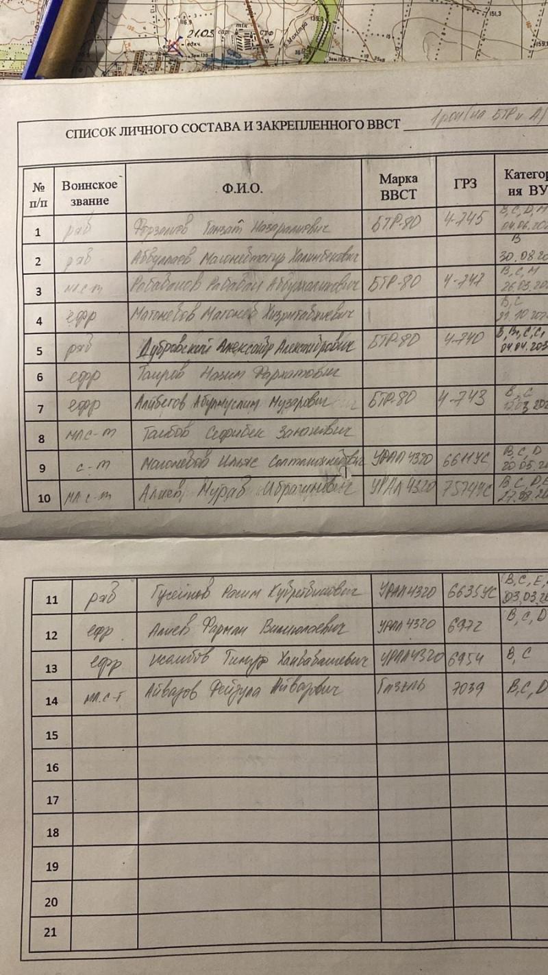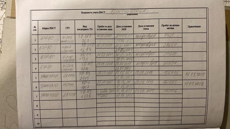 Відомість про бойову техніку підрозділу – чотири бронетранспортери «БТР-80» і три військові вантажівки «Урал 4320».