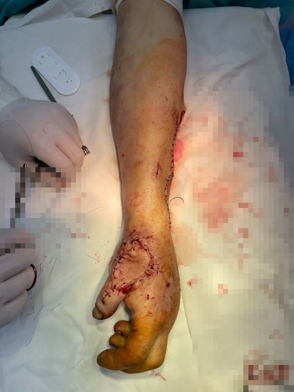 «У пацієнта була повна відсутність кісток першого пальця, запальний процес, відсутність тканин, ушкодження нервів, сухожилків та кісток зап’ястку. У 99% випадків за такої травми палець ампутують. Натомість, ми вирішили проводити поетапне лікування – спочатку органозберігаюча операція, під час якої припинили запальний процес, видаливши усі нежиттєздатні залишки кісток зап’ястку і пальця. Також відновили нерви і пошкоджені сухожилки. А для контуру нового пальця використали клапоть з передпліччя на судинній ніжці», – розповів Андрій Погоріляк.