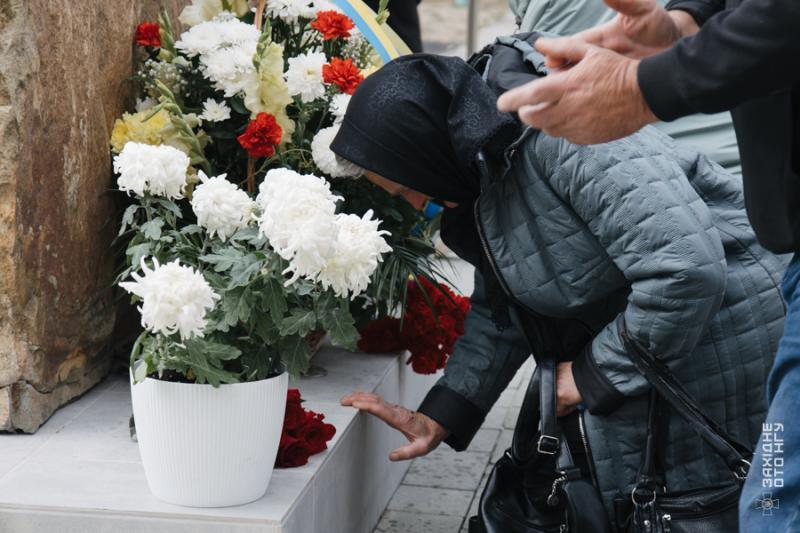Його автор – відомий скульптор-монументаліст Петро Матл. Разом із військовослужбовцями вшанували пам’ять полеглих родини нацгвардійців, волонтери, представники місцевої влади. Вони поклали квіти до меморіалу, схиливши голови у скорботі й вдячності.