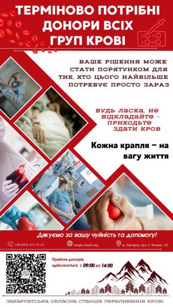 Закарпатська станція переливання крові повідомляє про термінову потребу в донорах