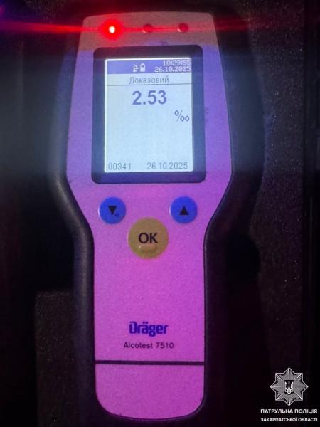 Під час спілкування з винуватцем поліцейські помітили ознаки алкогольного сп’яніння та запропонували пройти огляд за допомогою драгера. Результат — 2,53‰ алкоголю в крові.