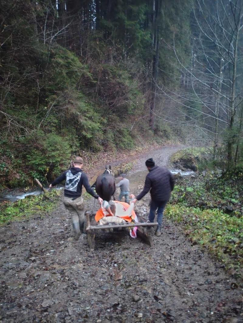 Після надання медичної допомоги і стабілізації стану пацієнта, місцеві жителі прийшли на допомогу — організували евакуацію хворого на повозці-волокуші, запряженій конем.