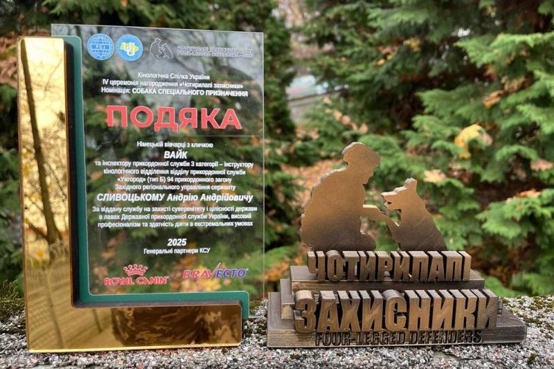 Кінолог відділу прикордонної служби «Ужгород» сержант Андрій Сливоцький разом зі службовим собакою Вайк взяв участь у IV церемонії нагородження «Чотирилапі захисники», організованій Кінологічною спілкою України. У церемонії були представлені кінологічні підрозділи Державної прикордонної служби, Збройних Сил України, Національної гвардії, Національної поліції, СБУ, Державної кримінально-виконавчої служби, Державної митної служби та ДСНС.