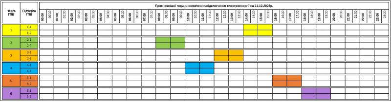 До уваги споживачів графік погодинних включень/відключень електроенергії на 11.12.2025