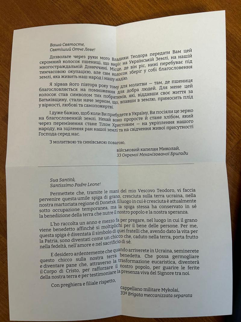 Владика Теодор подарував Святішому Отцеві папі Леву XIV колосок пшениці, зірваний на Донеччині - землі, яка сьогодні перебуває під тимчасовою окупацією. Цей колосок був привезений нашим військовим капеланом отцем Миколою Багіровим як мовчазний, але промовистий знак страждання, надії та незламної віри українського народу.