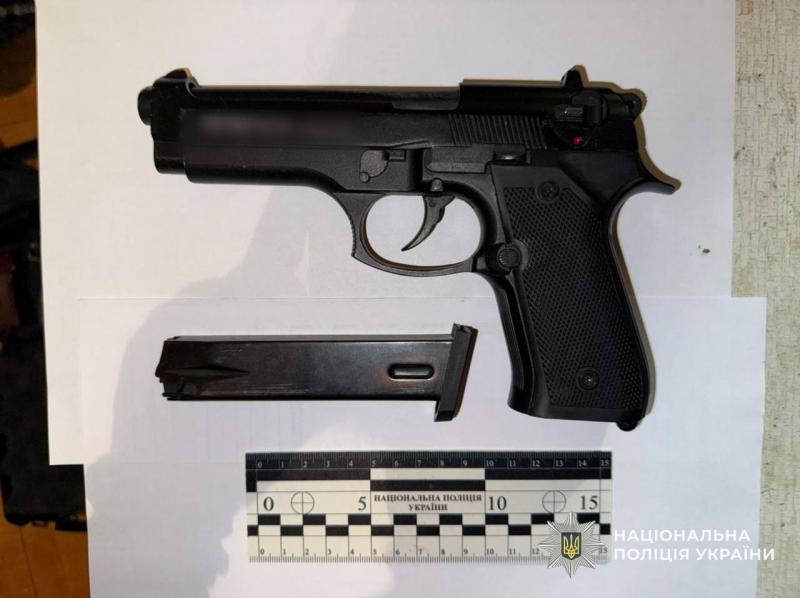 Поліцейські провели детальний огляд місця події. З квартири фігуранта вилучили пістолет із маркуванням «Retay mod 92 cal. 9mm P.A.K.», ще один пістолет у розібраному стані, а також рушницю з оптичним прицілом.