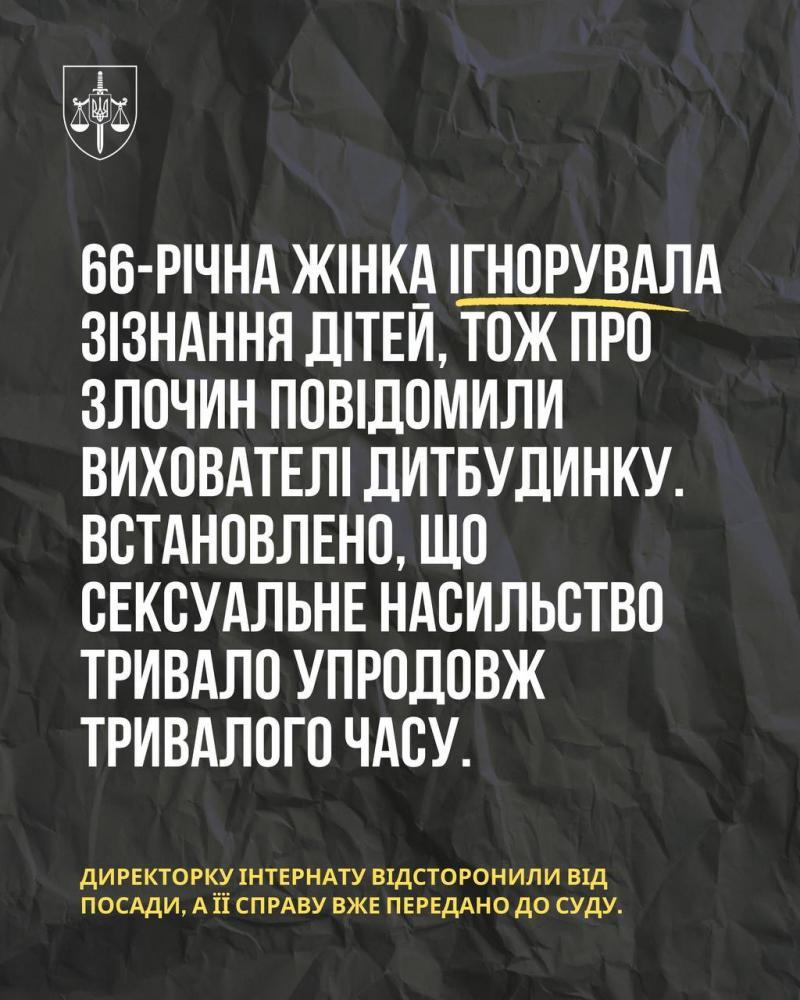 У межах загальнодержавної роботи на Закарпатті судитимуть колишню директорку дитячого будинку-інтернату, яка, за даними слідства, приховувала факти сексуального насильства щодо вихованців закладу.