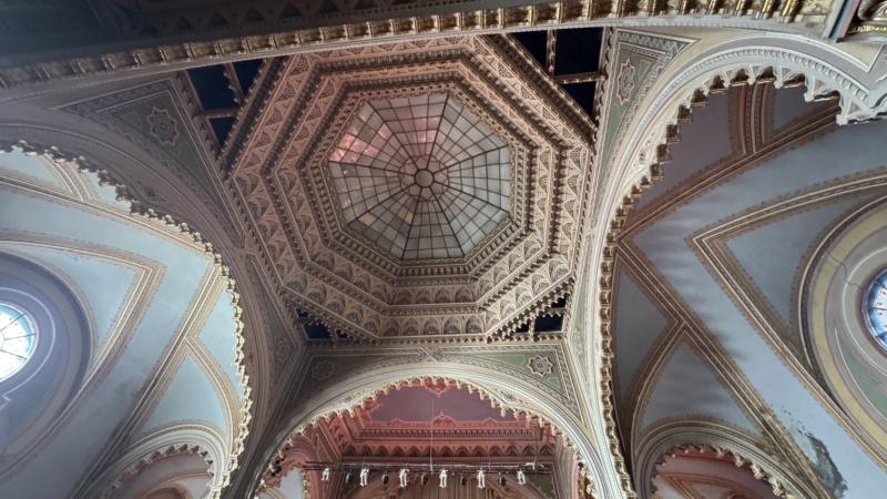 Будівлю зведено у 1904 році як велику ортодоксальну єврейську синагогу. На той час Ужгород мав численну єврейську громаду, а храм був одним із її духовних та культурних центрів. Синагога вирізнялася розкішною архітектурою: у її образі поєднувалися неомавританський та візантійський стилі, аркові вікна, декоративна цегла, символіка Старого Заповіту та зірка Давида. Простір усередині мав хорошу природну акустику, що згодом відіграло важливу роль у новому призначенні будівлі.