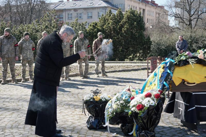 Чин похорону відбувся на площі Народній. Провести воїна в останню путь прийшли міський голова Богдан Андріїв, військові, містяни.