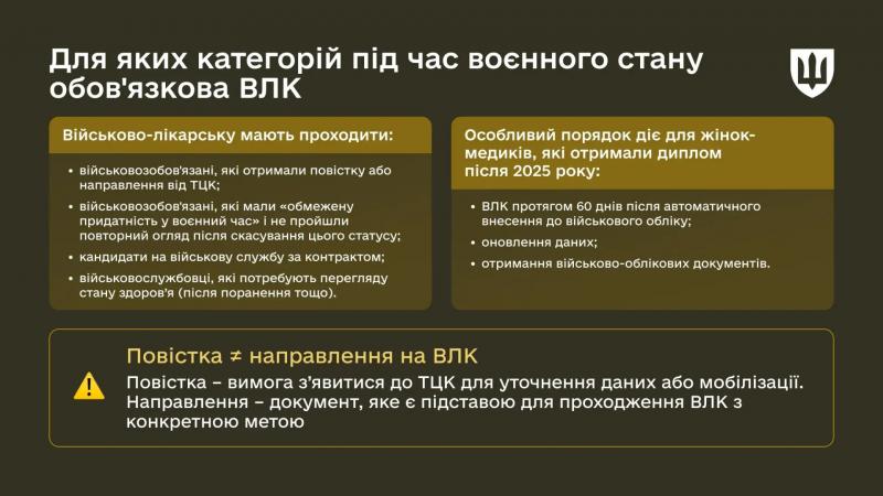 Крім того, діє особливий порядок для жінок з медичною або фармацевтичною освітою, які отримали диплом після 2025 року. Зокрема, вони мають пройти медогляд ВЛК протягом 60 днів після автоматичного внесення до військового обліку, а також оновити свої дані і отримати військово-облікові документи.