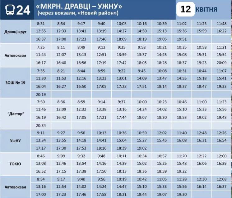Комунальне підприємство "Ужгородський муніципальний транспорт" надає графіки руху автобусів №№9, 18, 20, 22, 24 та 156 на Великодні свята 12-13 квітня 2026 року.