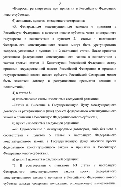 У документі також йдеться, що у разі ухвалення в РФ як нового суб'єкта частини іноземної держави цьому суб'єкту надається статус республіки, краю, області, автономної області або автономного округу.