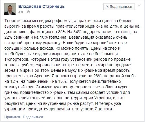 "Ціни на хліб і хлібобулочні вироби зросли, знову ж таки не без допомоги експортерів, які в цьому році встановили рекорд з продажу зерна за кордон. Україна посіла третє місце у світі з продажу зерна у світі. При цьому ціни на борошно в Україні за час роботи уряду Арсенія Яценюка зросли на 28%, на житній хліб - на 12%, на пшеничний - на 15%", - зазначає експерт.