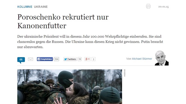 Усі ці призовники - "гарматне м'ясо", пише Штюрмер. При цьому варто зазначити, що під мобілізацію в Україні підпадають військовозобов'язані у віці від 25 до 60 років, а ніяк не з 16 років, як пише німецьке видання. Призов на строкову службу в Україні буде здійснюватися з 20 років, тому це ляп іноземного видання. Крім того, мобілізовані громадяни не будуть відразу відправлятися в зону АТО, а пройдуть загальновійськову підготовку (7-10 днів), відновлення бойових навичок (15 днів) та бойове злагодження (15 днів). Влада неодноразово заявляла, що строковики-новобранці взагалі не будуть направлятися в зону АТО.Штюрмер називає рішення про мобілізацію в Україні "відчаєм", а конфлікт на Донбасі, на його думку, "війна у всьому крім назви".