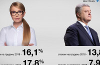 Фонд «Демократичні ініціативи» разом з центром Разумкова оприлюднили свіже опитування. Так, станом на грудень 2018 року Юлію Тимошенко підтримують понад 16% відсотків українців, чинного президента Петра Порошенка – майже 14%.
