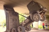 Цього разу вантажівка з причіпом зробила "розкриту книжку" прямісінько під мостопереходом.