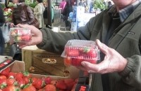 Ось уже цілий тиждень поспіль у одному з торгових рядів на ринку Берегова свіжу полуницю продає мешканець "сонячного" села Мужієво Федір Варга (на фото).