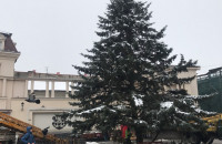 Спеціальна техніка й кілька робочих: ялинку вже прикрасили гірляндами, а опісля почеплять ще й іграшки.