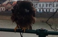 На площі Театральній в Ужгороді діти й дорослі активно фотографуються зі степовим орлом, якого "супроводжує" незнайомець.