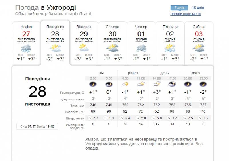 по Закарпатській області: Хмарно з проясненнями, часом слабкі опади. Вночі та вранці місцями слабкий туман. На високогір'ї складні відкладення. На дорогах ожеледиця. Вітер північно-західний 7-12 м/с. Температура повітря вночі 1-6° морозу, вдень 0-5° тепла, в горах місцями вночі 7-12° морозу, вдень 4-9° морозу.по м. Ужгород: Хмарно з проясненнями, без істотних опадів. Вночі та вранці слабкий туман, на дорогах ожеледиця. Вітер північно-західний 7-12 м/с. Температура повітря вночі 2-4° морозу, вдень 1-3° тепла.