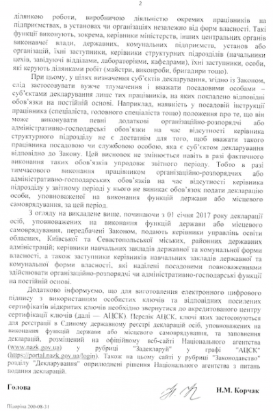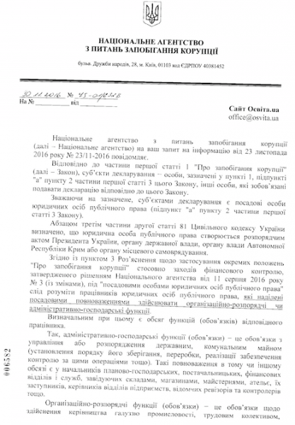 «З огляду на викладене вище, починаючи з 01 січня 2017 року декларації осіб, уповноважених на виконання функцій держави або місцевого самоврядування, передбачені Законом, подають керівники управлінь освіти обласних, Київської та Севастопольської міських, районних державних адміністрацій; керівники навчальних закладів державної та комунальної форми власності, а також заступники керівників навчальних закладів державної та комунальної форми власності, які наділені посадовими повноваженнями здійснювати організаційно-розпорядчі чи адміністративно-господарські функції на постійній основі», - повідомили у Національному агентстві з питань запобігання корупції.