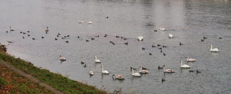 Сьогодні неподалік пішохідного мосту плавають кількома зграями-сім'ями вже 25 білих і сірих молодих особин лебедів. Світлини з цим незвичним явищем опублікував на своїй сторінці у соцмережі "Facebook" ужгородський блогер Олександр Богданов.
