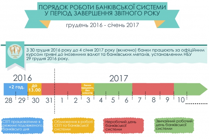 3 січня 2017 року банки працюватимуть без клієнтів і забезпечуватимуть комплекс робіт, пов’язаних із початком нового звітного року. Міжбанківські перекази коштів через СЕП у цей день не здійснюватимуться.