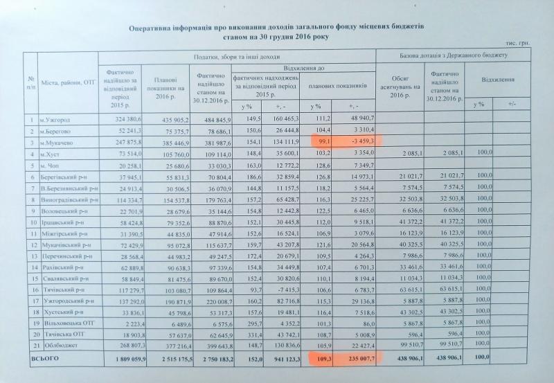 З усіх місцевих бюджетів, що мають прямі відносини з Держбюджетом України, за підсумками року тільки Мукачево не виконало планові показники й не добрало 3 мільйони 459 тисяч гривень.