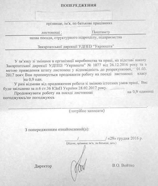 Про таке рішення розповів закарпатському журналісту Віталію Глаголі один з працівників пошти. За його словами, при таких змінах графік роботи залишається таким, як і був, обсяг роботи теж. Але найцікавіше те, що тих, хто не згоден з цим - обіцяють звільнити.
