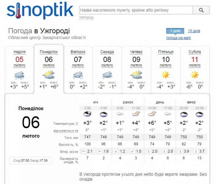 по м. Ужгород: Хмарно, без істотних опадів. На нерозчищених ділянках доріг ожеледиця. Вночі та вранці туман. Вітер змінних напрямків 3-8 м/с. Температура повітря вночі 0-2° тепла, вдень 5-7° тепла.