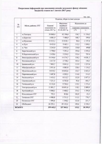 Протягом січня 2017 року місцеві бюджети Закарпатської області загалом зібрали 237 мільйонів 843,1 тисяч гривень (для порівняння – за січень минулого року ця сума становила 150 мільйонів 51,5 тисяч гривень, зростання становить 158,5 відсотків). Планові надходження в цілому по області не тільки виконані, але й перевиконані на 19,3 відсотків. Ужгород перевиконав план зборів на 36,7% (плюс 11 млн. 336,2 тис. грн.), Берегово – на 8,7% (плюс 599 тис. грн.), Хуст – на 12,3% (плюс 1 млн. 40,1 тис. грн.), Чоп – на 30,8% (плюс 690,8 тис. грн.). З усіх міст обласного підпорядкування тільки Мукачево не виконало планові надходження до міського бюджету на 3,4% (недобір становить 1 млн. 197 тис. грн.).
