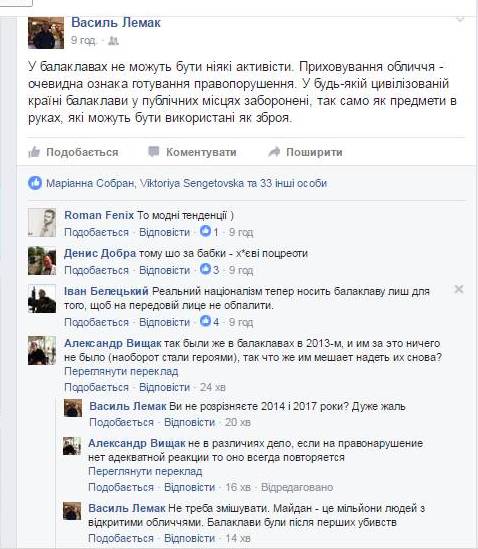Доктор юридичних наук, професор УжНУ Василь Лемак на своїй сторінці у Фейсбуку написав наступне: "У балаклавах не можуть бути ніякі активісти. Приховування обличчя - очевидна ознака готування правопорушення. У будь-якій цивілізованій країні балаклави у публічних місцях заборонені, так само як предмети в руках, які можуть бути використані як зброя".