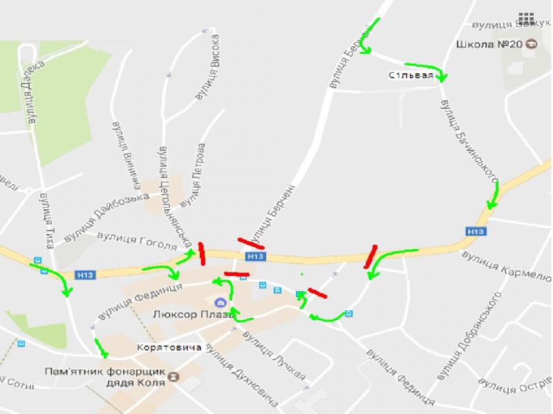 перехрестя вул. Берчені – пл. Корятовича; за перехрестям вул. Підгірна – Гоголя – Цегольнянська; за перехрестям вул. Лучкая – пл. Корятовича (перед «Люксор-Плаза»); за перехрестям вул. Підгірна – вул. П.Мирного; за перехрестям вул. Підгірна – Вакарова – вул.Фединця.
