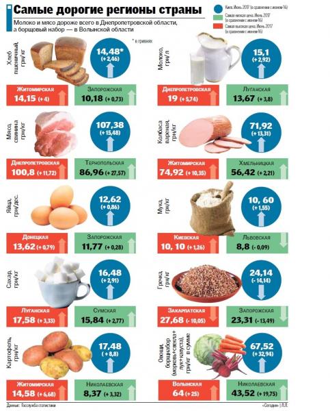 ДОРОЖЧАЄ ВСЕ. Як видно з інфографіки, за рік подорожчали не тільки овочі, але і м'ясо, молоко, хліб. Зростання цін склав в залежності від регіону 7-28% на хліб, 4-14% на ковбасу, 12-32% на м'ясо, 27-30% на молоко, хліба. Трохи стриманіше (в середньому на 5-7% зростання за рік) поводяться ціни на бакалію. А ось гречка подешевшала в 1,5 рази.
