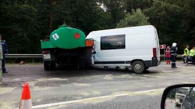 "4 липня о 19:15 водій бензовоза" ЗІЛ 431412 "виїхав на смугу зустрічного руху і зіткнувся з автомобілем" Пежо Боксер "під керуванням 68-річного львів'янина", повідомляє ГУНП України у Львівській області.