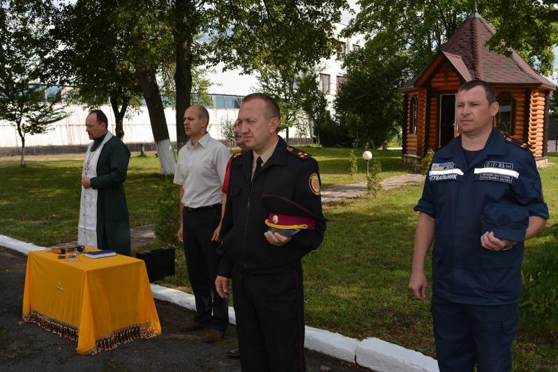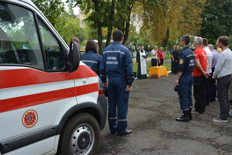 Далі, за християнським звичаєм, настоятель церкви Спаса Преображення, що в м. Ужгород, отець Іоанн провів обряд освячення працівників ДСНС, які відбувають у відрядження та транспортного засобу, на якому вони їдуть у зону проведення антитерористичної операції.