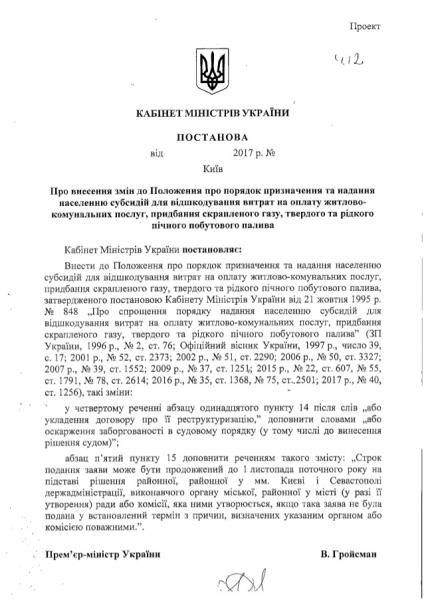 Кабінет міністрів також дозволив перепризначати субсидії на новий опалювальний сезон громадянам, які мають заборгованість за два і більше місяців в оплаті житлово-комунальних послуг, але не визнають її і звернулися до суду, до моменту вирішення питань у суді.